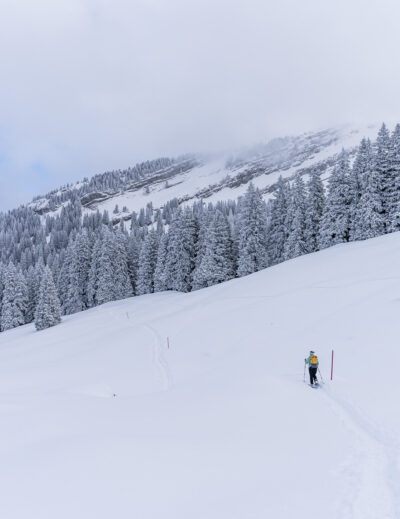 El sendero de raquetas Panüöl–Prodalp está señalizado con el número de ruta 731 y desciende suavemente desde Panüöl hasta Prodalp. Si prefieres un poco más de esfuerzo, también puedes hacer la ruta en sentido contrario. El sendero invernal comparte en parte el trazado con la pista de esquí de fondo. Estos tramos están acondicionados para ambos usos: el lado izquierdo está destinado a los peatones, el derecho a los esquiadores de fondo.