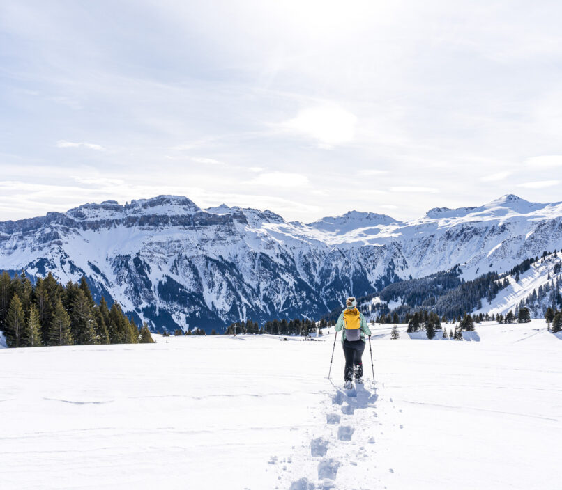 L’entrée du sentier de raquettes est bien indiquée et difficile à manquer. La courte boucle à travers le plateau de Plattis est considérée comme facile et n’a pas de difficultés notables. Du moins en théorie. En réalité, nous avons trouvé une image quelque peu différente : avec de la neige fraîche jusqu’aux genoux, personne n’avait encore tracé la piste. Au lieu d’un échauffement détendu, nous avons eu droit à un entraînement intensif inattendu. Mais cela en valait la peine. La vue panoramique sur les sommets environnants, en particulier le Spitzmeilen au profil dentelé, combinée au magnifique temps hivernal, nous a plus que compensés.