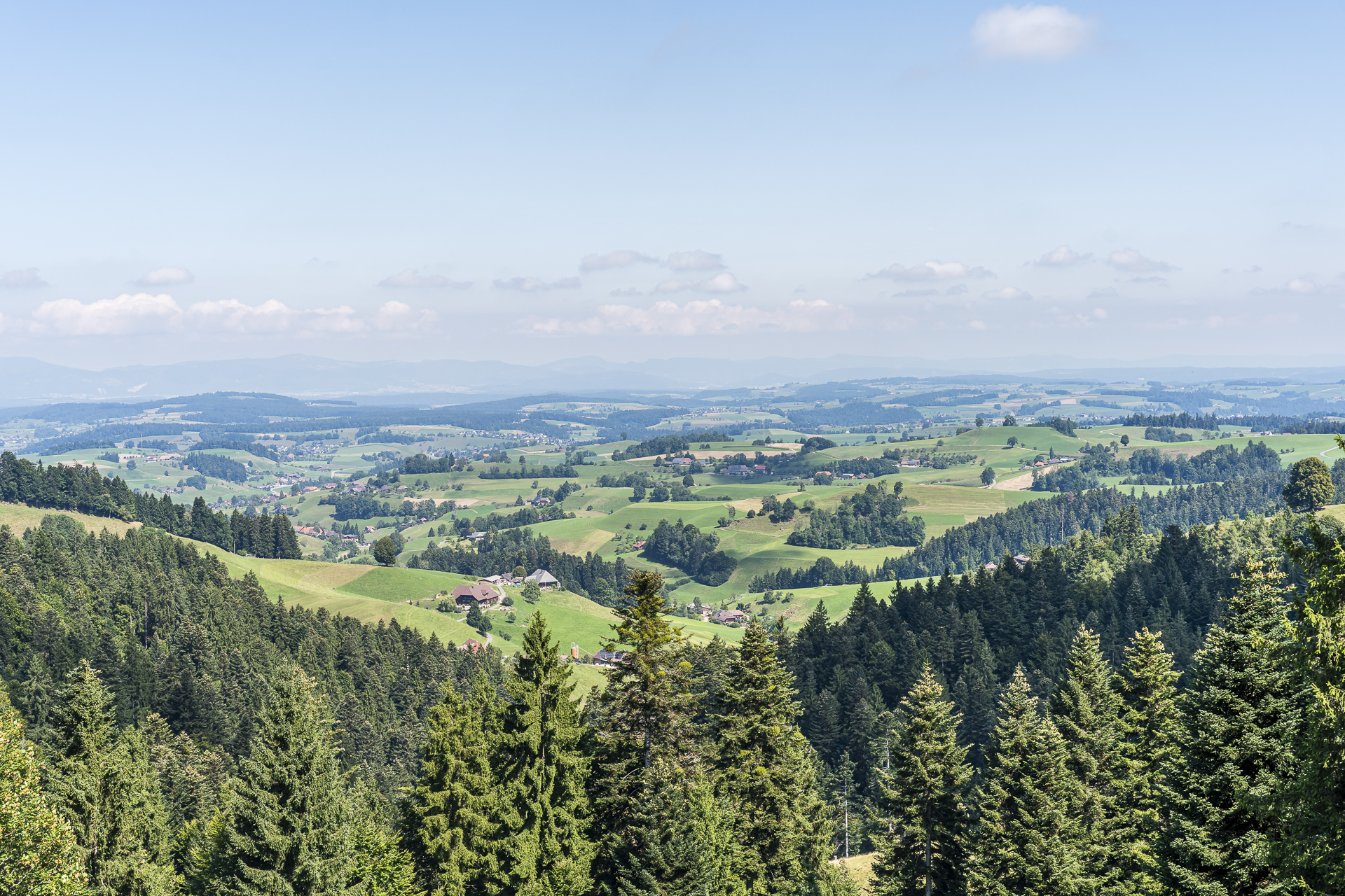 To get back on the actual route, we must first climb the steep 330 feet from Kuttelbad to the main hiking trail. After that, an enjoyable stretch takes us through a storybook Emmental landscape down to Wasen, a district of the Sumiswald municipality. Compared to the first two days with their numerous elevation gains, this section feels like a comfortable conclusion. However, the typical Napf region ups and downs don’t completely disappear. From Wasen onward, we follow signposts toward Hornbachegg and Fritzeflue with a steady climb, first on a paved road and later on nice forest and meadow trails. Magnificent views repeatedly open up toward the rolling hills we hiked through the previous day.