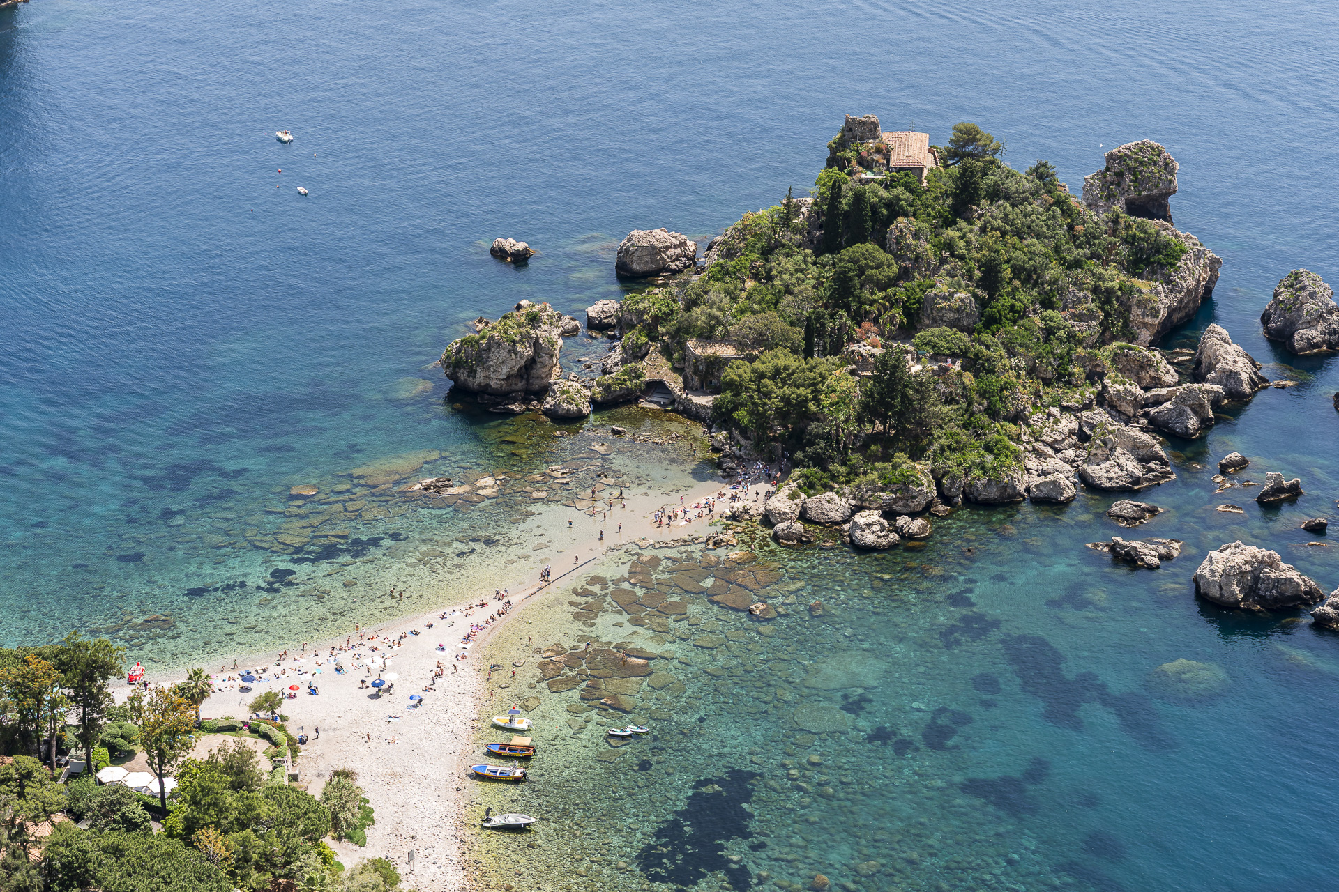 A personal highlight for us was the short trip up to the village of Castelmola. The short hike there takes about an hour and rewards you with wonderful views of Taormina and the coast. For a refreshment stop, Antico Caffè San Giorgio is well worth it, where we treated ourselves to a classic Sicilian combination of granita and brioche. Afterward, we headed back to Taormina and from there took the cable car down to Mazzarò by the sea. This is also where picturesque Isola Bella is located, a small island connected to the beach by a narrow strip of sand.