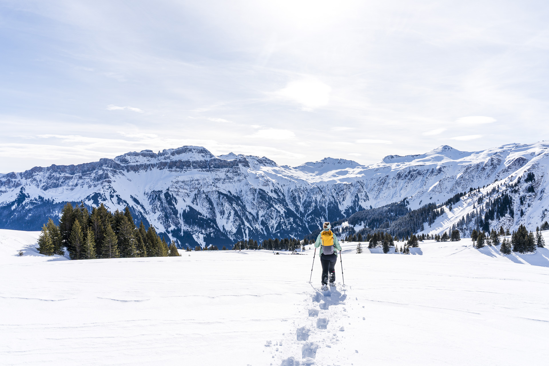 Flumserberg quickly came out on top. This winter sports area in Eastern Switzerland scores points not only for its ski slopes, but also for several marked snowshoe trails and scenic winter hiking paths. We combined two of them, both with dreamy views of the surrounding peaks and soothing peace and quiet away from the slopes.